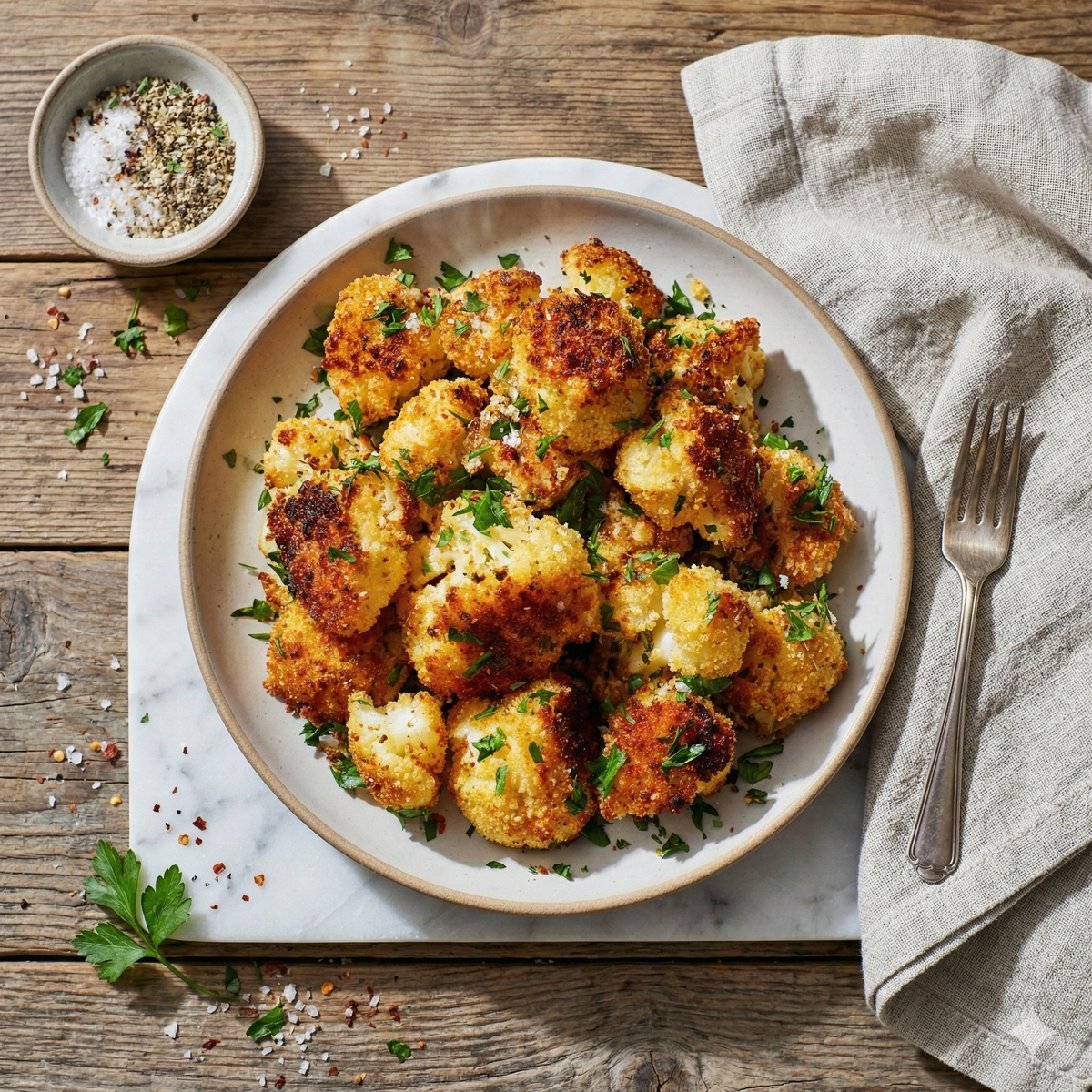 Cette version transforme le chou-fleur en snack doré, parfumé au paprika et au persil. Idéal en accompagnement ou pour remplacer des frites lors d’un repas convivial.