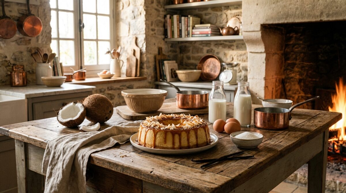 Et si vous êtes un peu comme moi, avec parfois un peu trop de neige blanche dans votre placard, vous allez aimer l’idée. La noix de coco râpée parfume sans être trop envahissante, ça reste doux, juste ce qu’il faut. Pas de surprise, c’est le cocon gourmand du flan vintage remis au goût du jour.